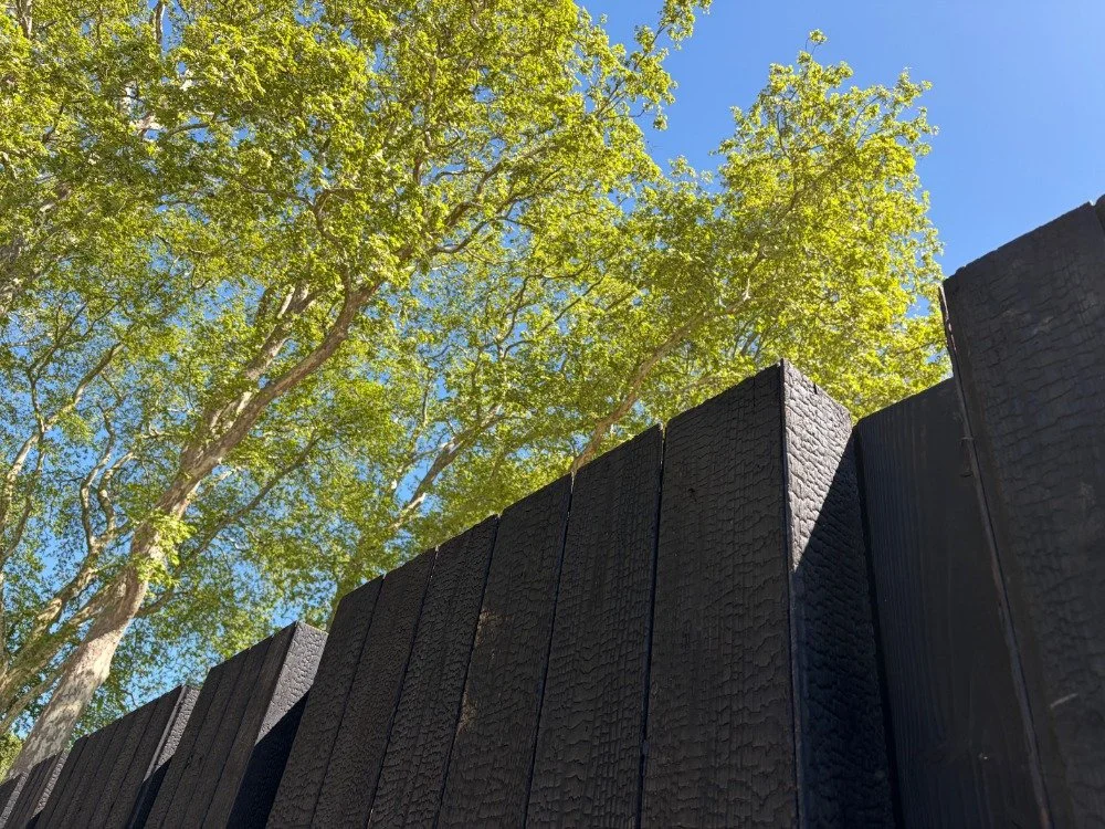 Our first task on site was to construct our boundary. Made from sustainably sourced charred timber, this will be re-used at our relocation site at Rotherham Breathing Space to form a new potting shed/tea hut.