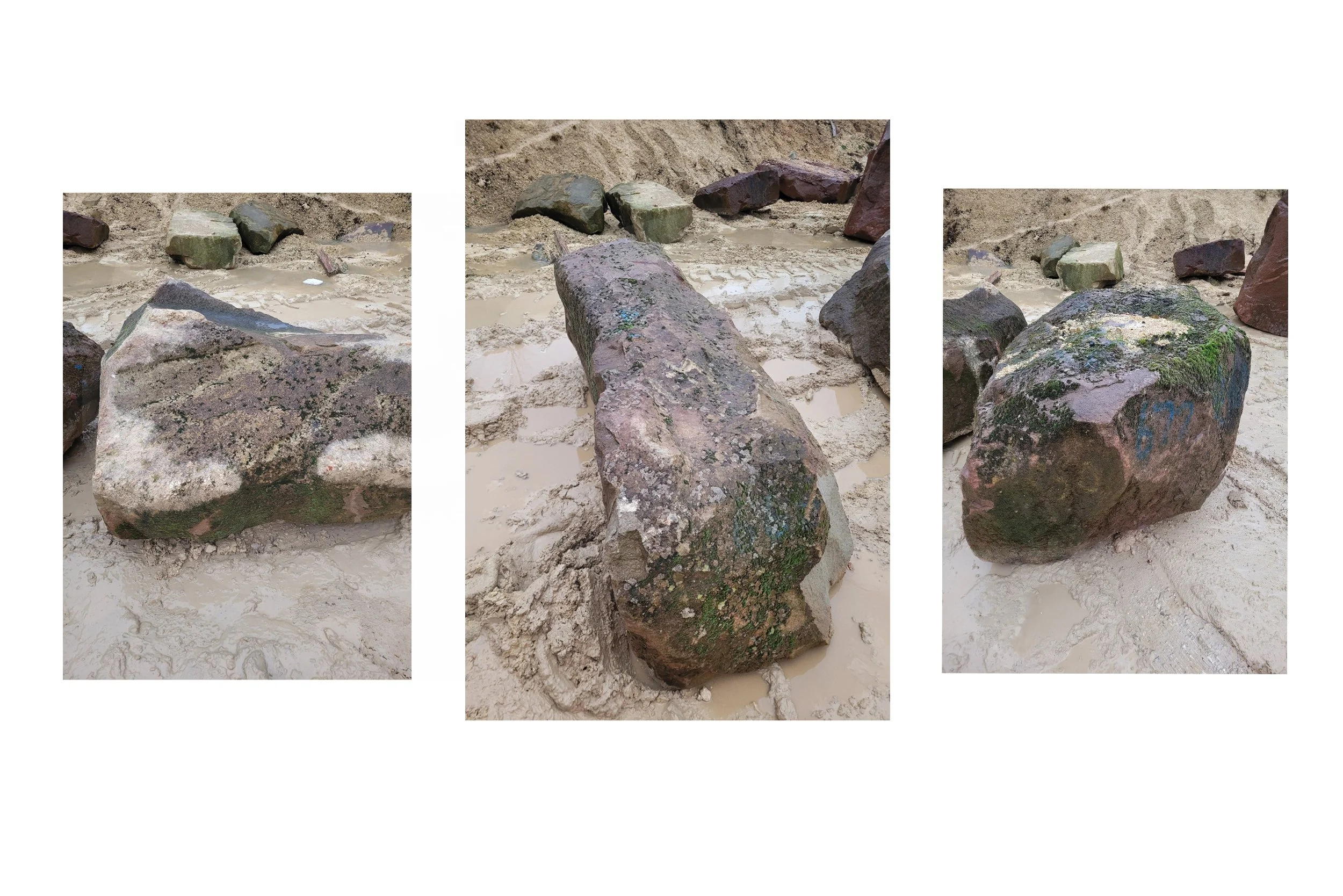 And so to Cadeby quarry in Yorkshire; a quarry close to our final Rotherham garden rebuild with a view to sourcing 3 or 4 feature sandstones to embody the gnarled ‘existing landscape’ narrative of our Chelsea garden. Measuring over 2m in some cases, these pieces have an aged patina to them. In their raw state they exhibit strong red/ lilac hints which soften with age.